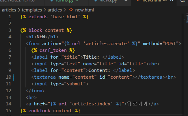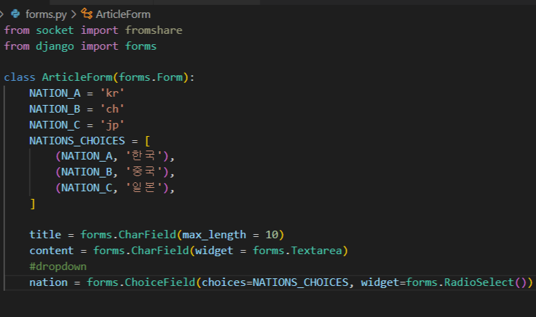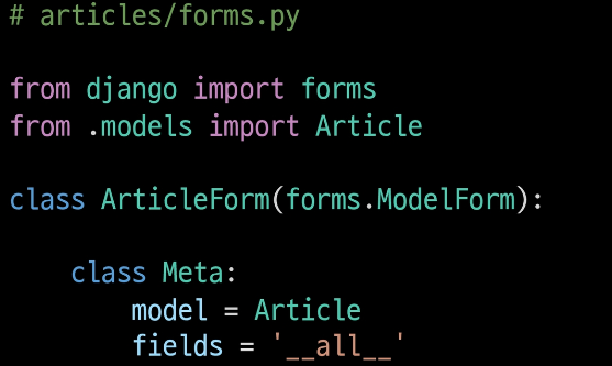 -> 앱 폴더에 forms.py를 생성 후 ArticleFrom class 선언