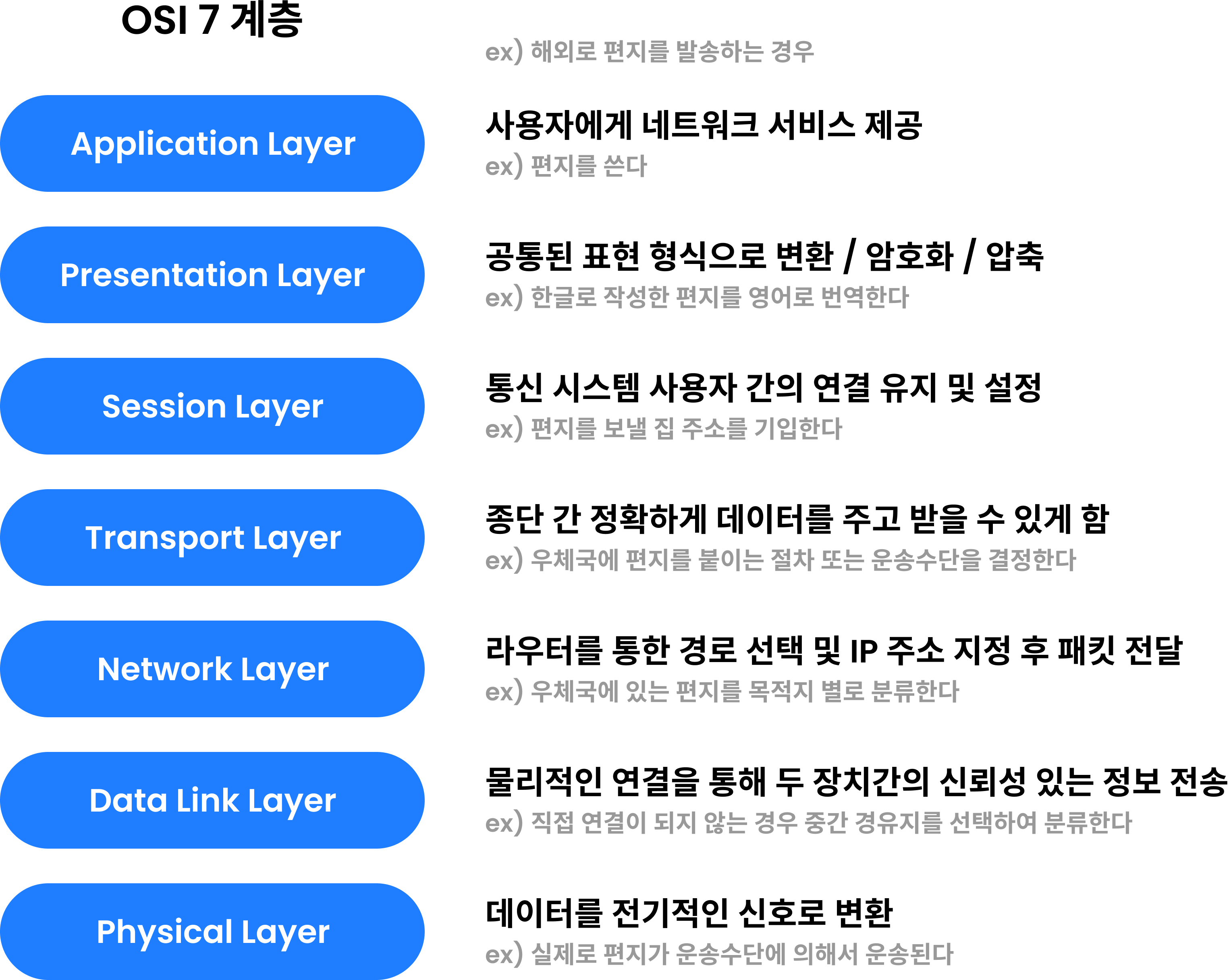 데이터를 주고 받는 과정에는 많은 단계가 있고, 이를 역할에 따라 7개의 계층으로 나눈 것.