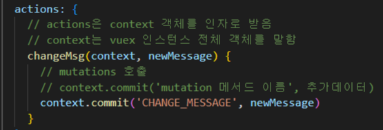 - actions의 첫 번째 인자는 context, 두 번째 인자는 payload (넘겨준 데이터를 받아서 사용)