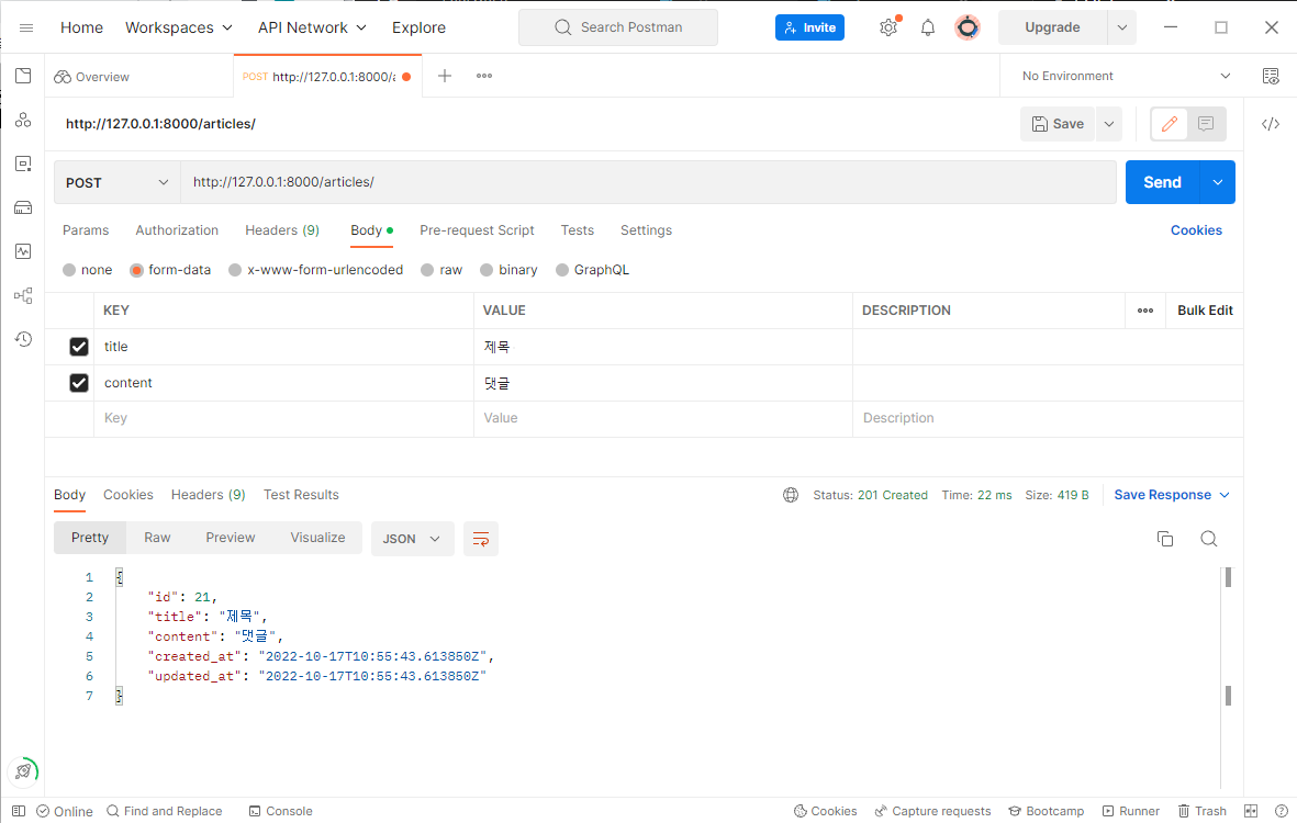 | articles/<int:article_pk>/ | 상세 글 조회 | . | 해당 글 수정 | 해당 글 삭제 |