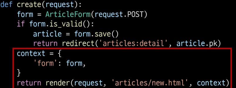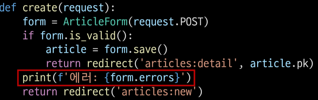 - 반환 값이 False일 경우 form 인스턴스의 errors 속성에 값이 작성됨 ( 실패 원인이 딕셔너리 형태로 저장 )